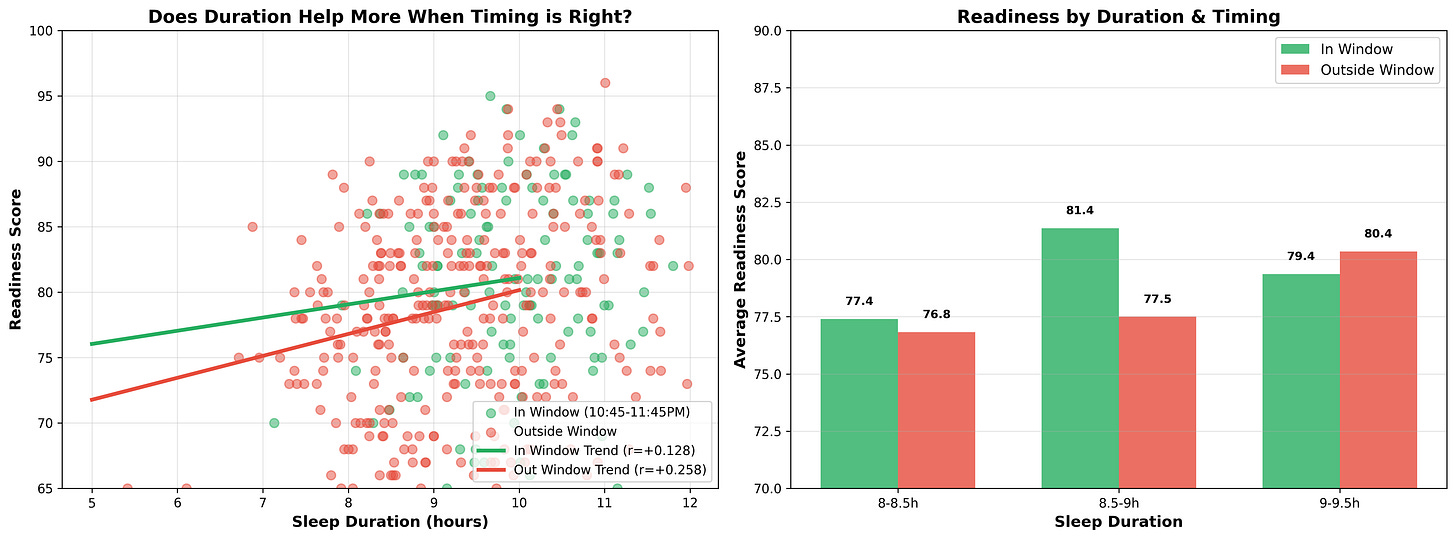 When I slept outside that window - even for the same number of hours - recovery weakened. Heart rate fell more slowly. Deep sleep shifted later. The nadir crept toward morning. Readiness dropped.