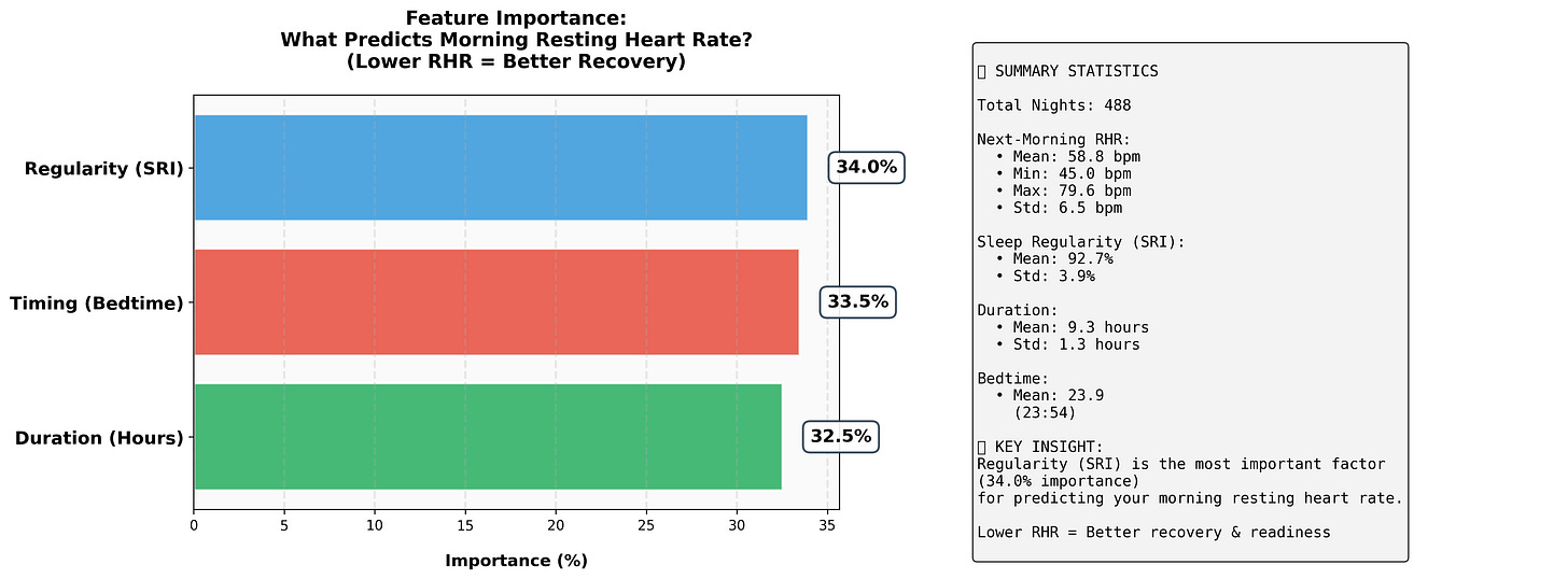 Here’s what surprised me: bedtime alone explains almost nothing. The direct correlation between bedtime and RHR was r = 0.07 - just 0.4% of variance, not even statistically significant.