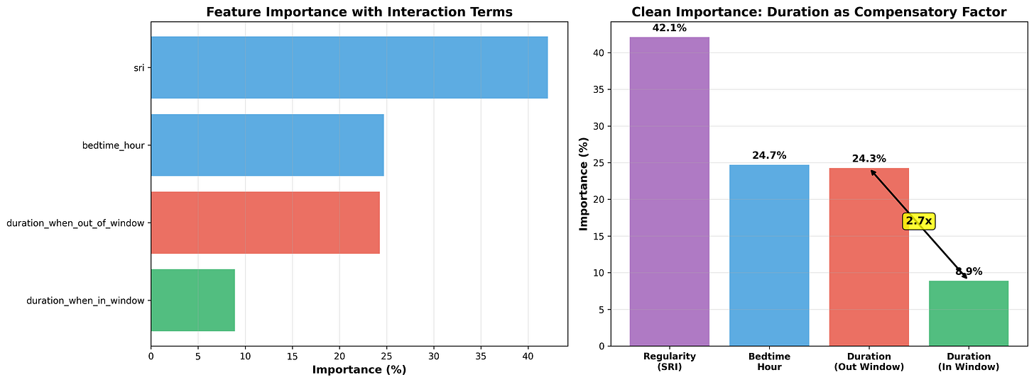 What the clustering found wasn’t a bedtime cutoff. It found nights where multiple small things drifted together: timing shifted slightly, regularity dropped slightly, duration fell slightly. No single variable crossed a line. The combination flipped the physiology.