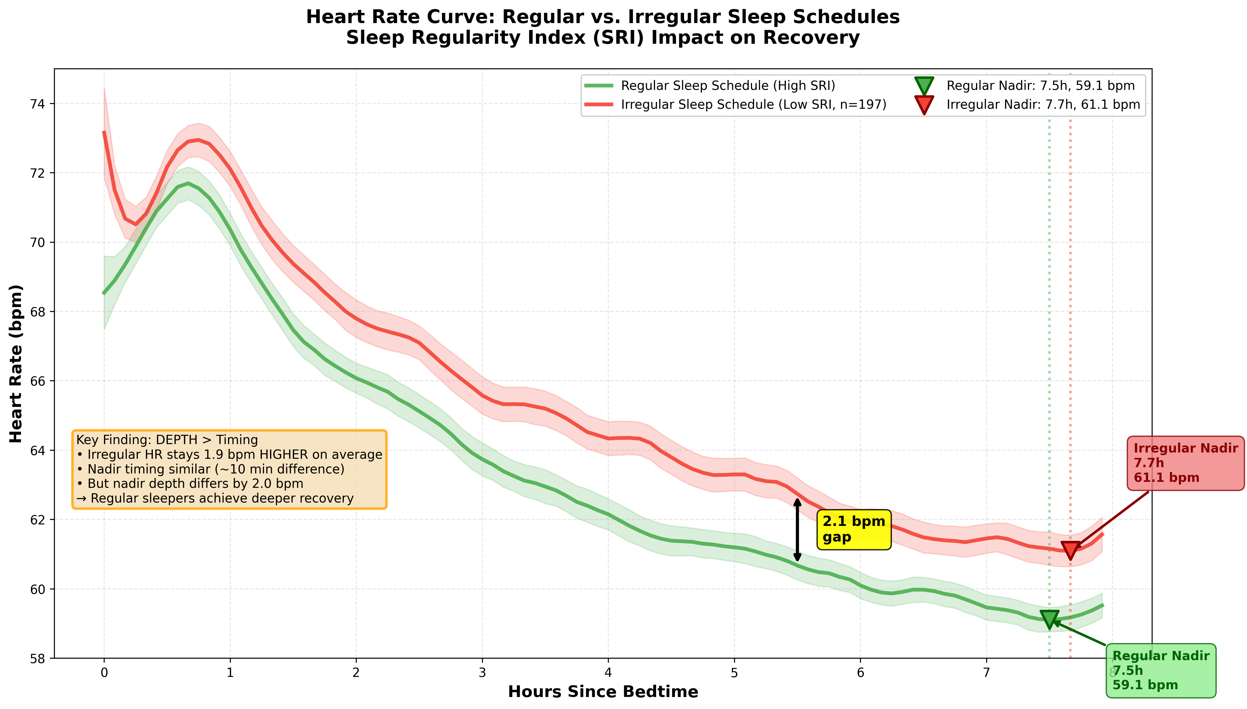 Regular nights show an earlier, smoother HR descent and earlier nadir. Irregular nights shift the entire curve later and higher.
