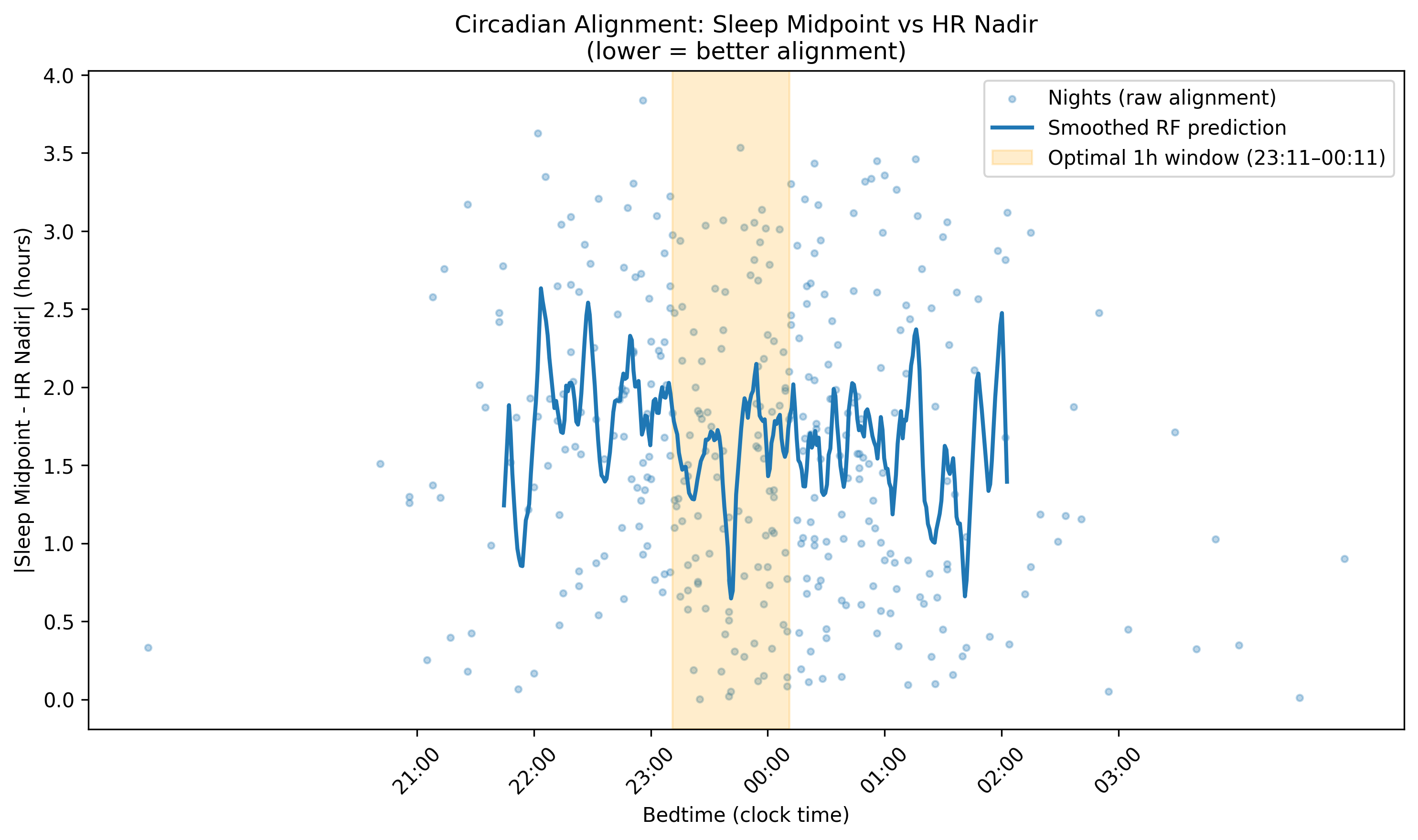 The smaller the gap between these two moments, the better your sleep window overlaps with your body’s internal recovery cycle. If you sleep from 11 PM to 7 AM (midpoint: 3 AM) but your HR nadir happens at 5 AM, you’re misaligned by 2 hours. You’ve started sleeping before your body was ready for deep restoration.